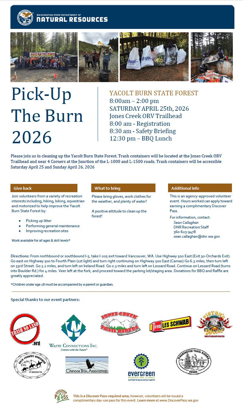 The annual Pick Up The Burn community volunteer event is scheduled for Saturday, April 25, 2026. Meet at the Jones Creek Trailhead parking lot at 8 AM.