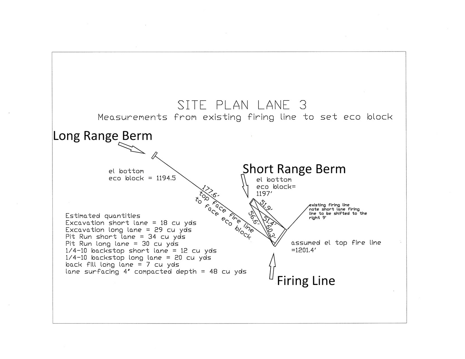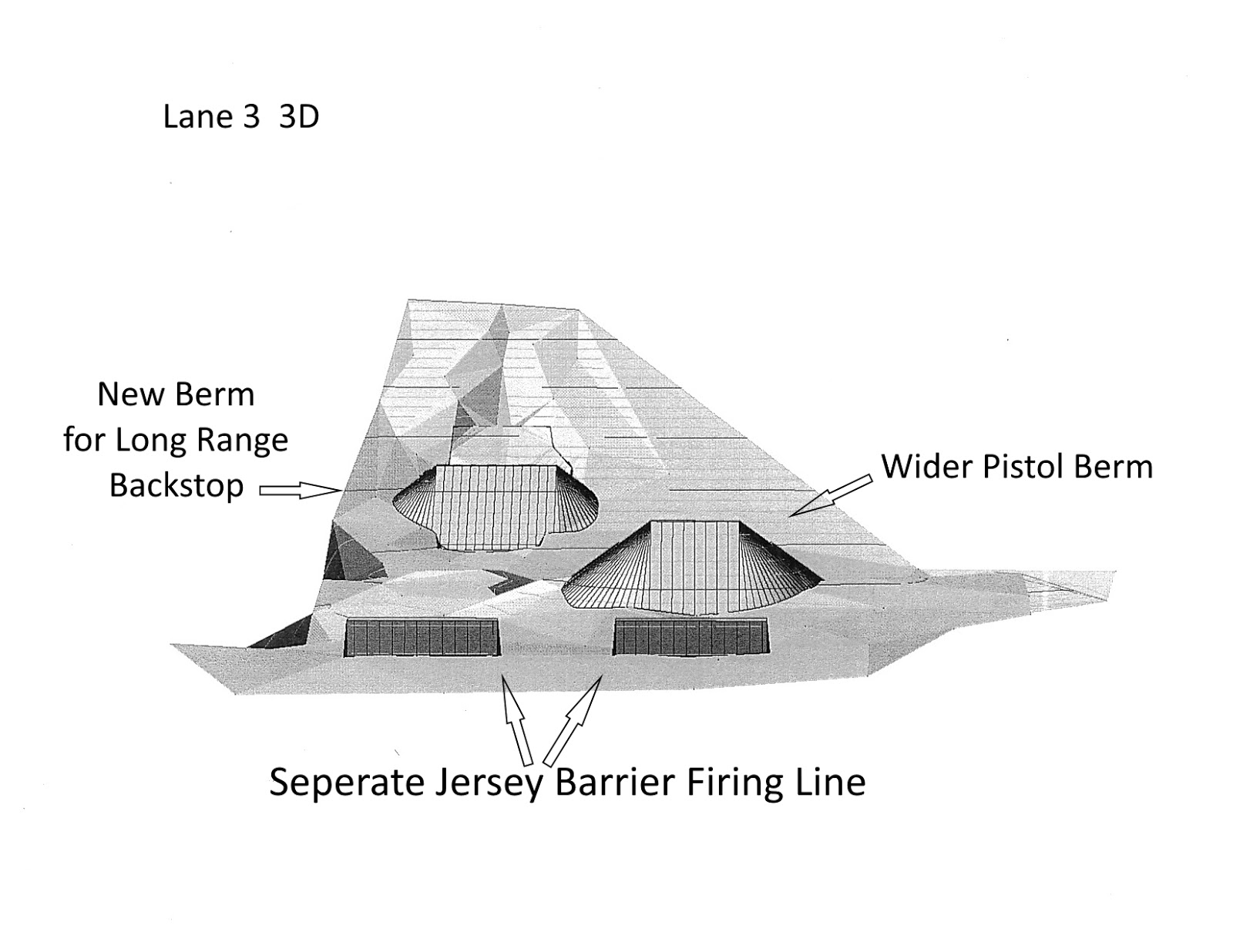 The work planned for Lane 3 will include a rebuilt short range pistol berm. A new berm for the long range in front of the hillside backstop, grading and gravel of the lane surface. The short pistol berm will be wider and the firing line Jersey Barriers will be aligned to accommodate the new berm width.