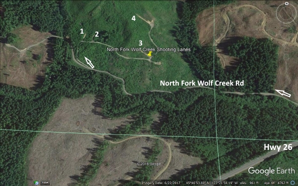 Hwy 26 West, 35 miles from the Hwy 217 junction at Beaverton. Turn Right onto North Fork Wolf Creek Rd, take 2nd right up hill to shooting lanes. Meet at lane 3.