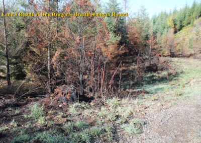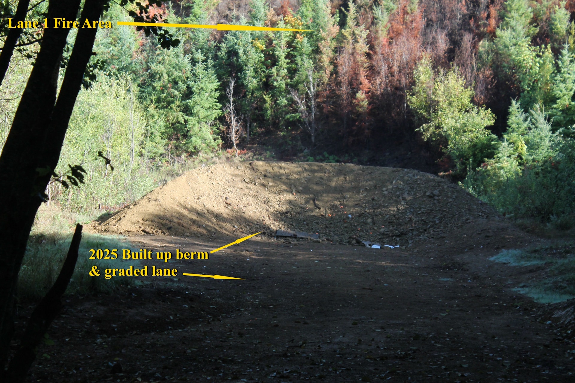 Lane 1 & 2: Extend both lanes all the way back to the hillside. Brush out vegetation on both sides of each lane to create a fire protection buffer. Build up a berm along the side between lanes 1 & 2 to prevent cross fire from one lane to the other. Lane 2 extension will be from 28 yards to about 72 yards.